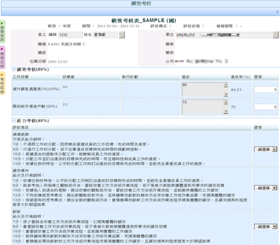 提供員工設定個人績效目標,執行績效考評作業,維護個人平日表現事蹟及個人發展改善計畫,與查詢個人績效考核狀況。