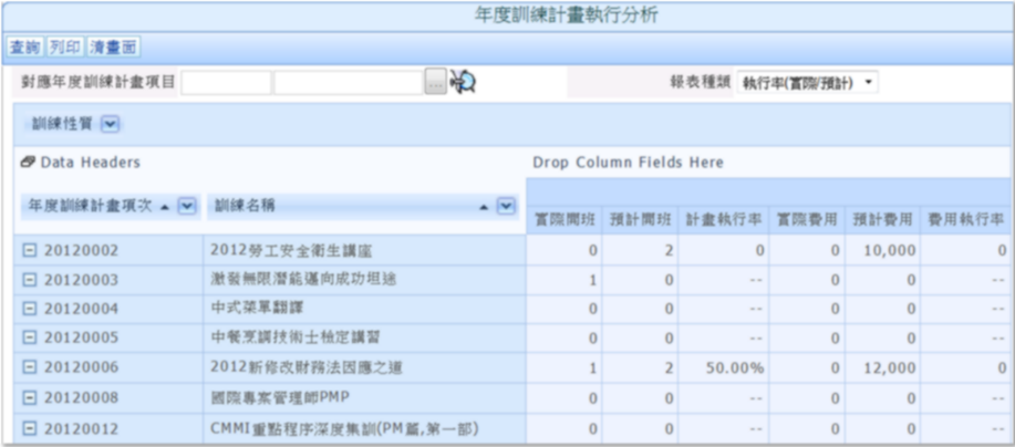建立課程年度開課計畫,並結合日常的開課作業,提供訓練課程相關費用支出、部門分攤的報表,以及課程計畫與實際費用的統計表。